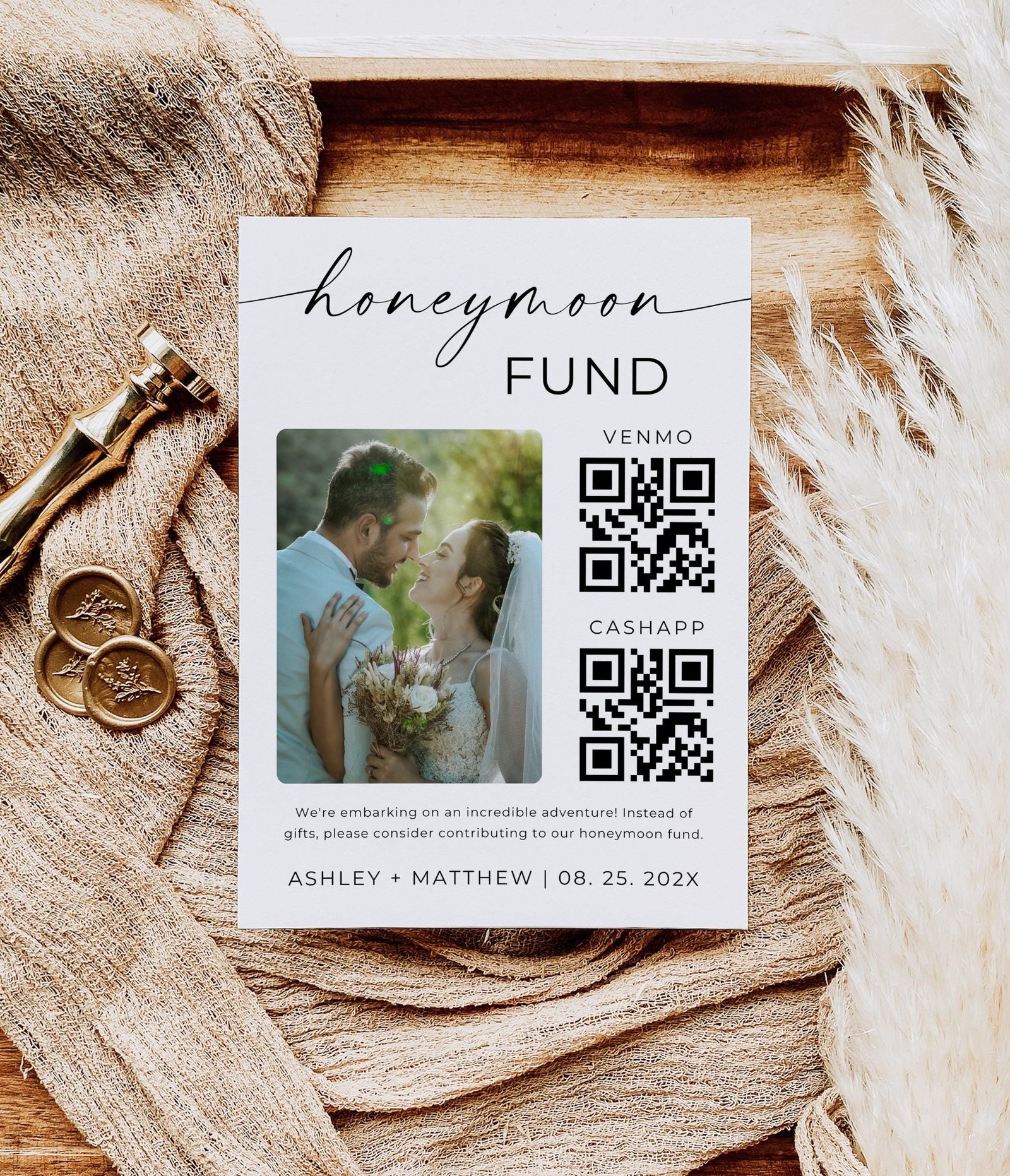 Designed for minimalist, boho, rustic, or modern weddings, this digital sign is not only stylish but also incredibly convenient. Simply download, print, and display it at your wedding reception, welcome table, or bridal shower to start collecting contributions for your dream honeymoon instantly.