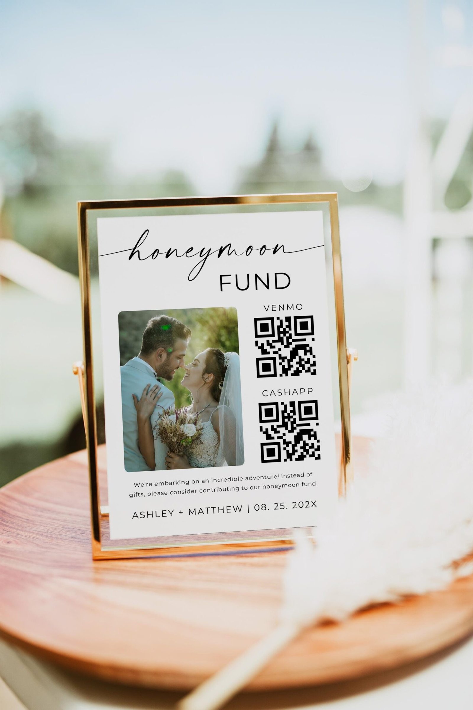 Make your big day even more memorable with a modern twist on gift-giving. The Honeymoon Fund Wedding Sign QR Code allows guests to easily donate to your honeymoon fund by scanning a custom QR code that links directly to your Venmo, PayPal, or preferred payment platform.