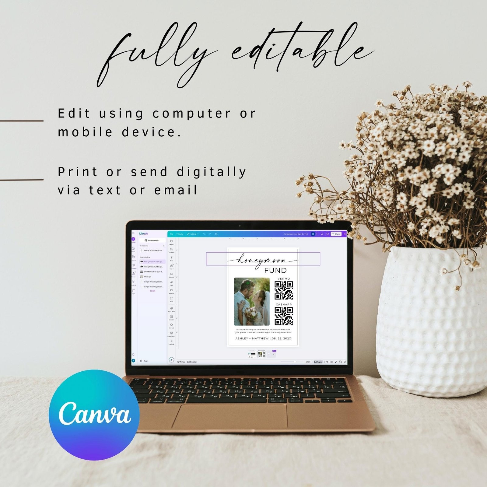 “Are you planning a wedding but don’t have the money yet? No problem! With this honeymoon fund sign, you can easily start raising money for your big day. Just print out the QR code and post it around your venue or use the link to send people money online via Venmo. This modern minimalist wedding sign is perfect for a boho wedding or any modern event. Plus, it’s super easy to set up – just print out the PDF file and hang it up!”